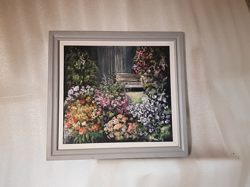 Tableau signé daté titré : Jardin en été. Peinture huile sur panneau.